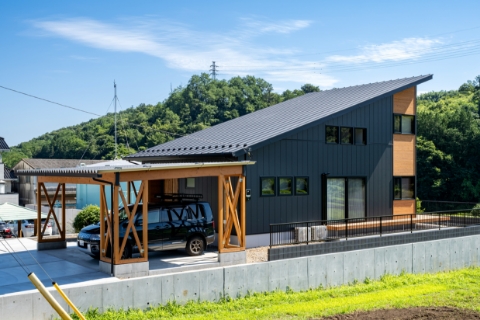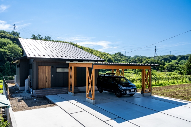 自社大工が手作りした木製のオープンガレージ。オープンですが、玄関から繋がっているので濡れずに入ることができます。