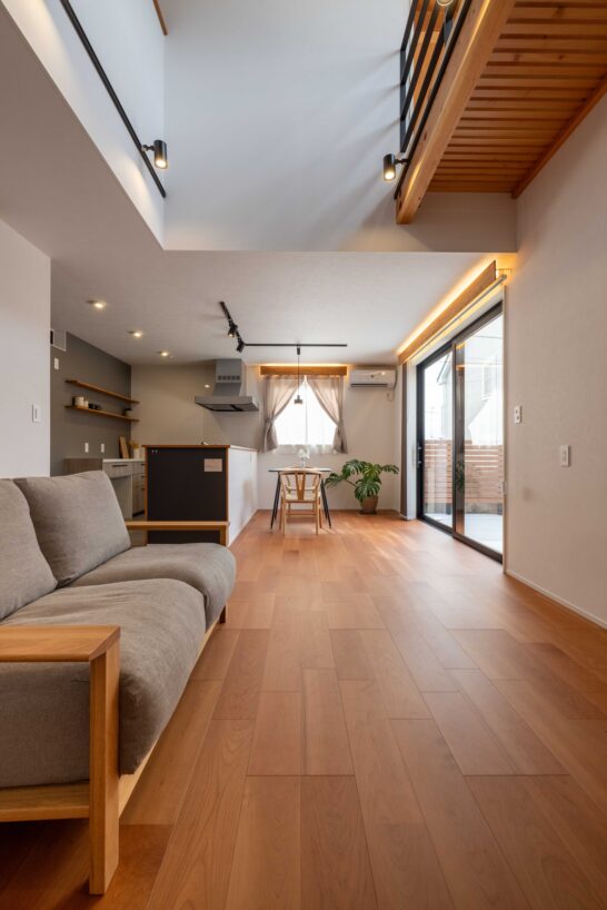 吹抜けからLDKに心地よい光が差し込む窓計画により 日中、照明を使わなくても明るい吹抜けリビングを実現。