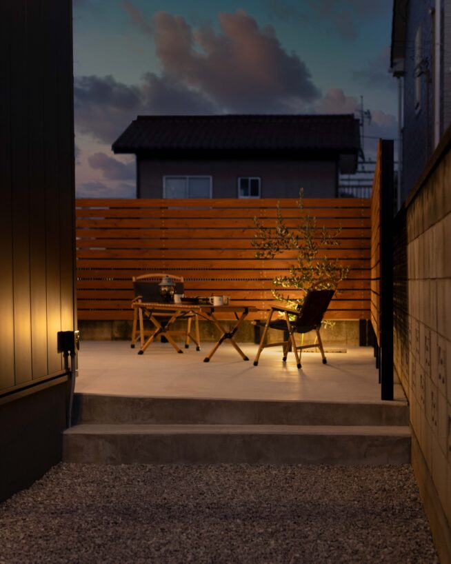 インナーガレージやフェンスで適度に閉じられた中庭スペースを通じて内と外をつなぐ庭が心地よいLDK。
