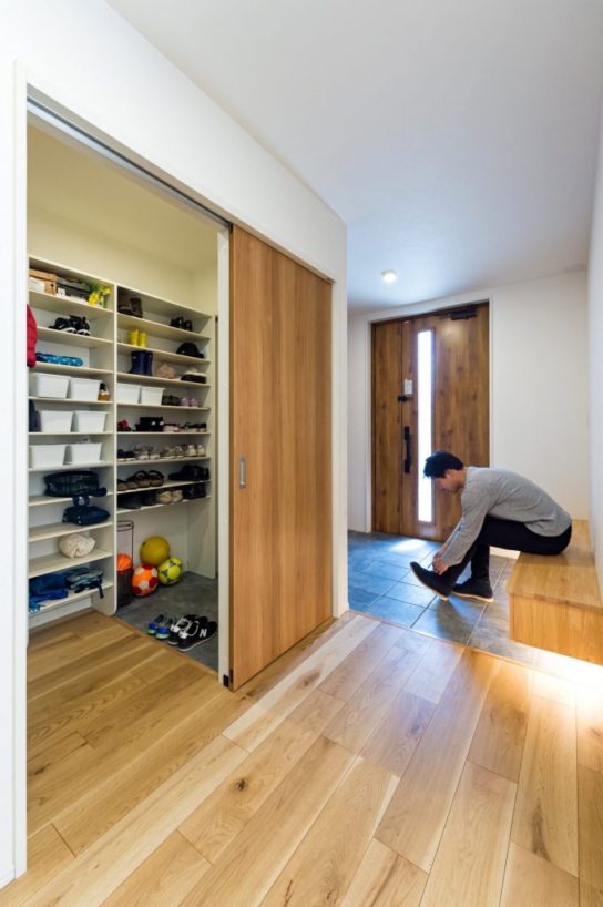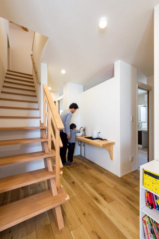 「家族がのびのびと過ごせるように、つながりを感じられる大空間がほしい」というご要望に合わせ、大きな吹き抜け空間を設けた開放感を意識して設計。一緒に住まう夫人のお母様も末永く快適に過ごせるように、玄関ホールと室内をフラットにしたバリアフリー仕様にしました。