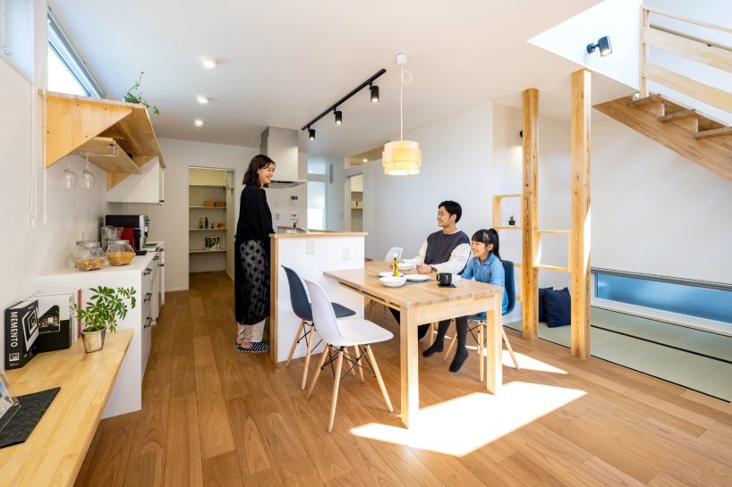 1階は広々としたリビング、 畳コーナー、造作家具で設えたカウンターキッチンを中心にした回遊動線、広々パントリーがあり家族が温もりを愉しめる家になっています。