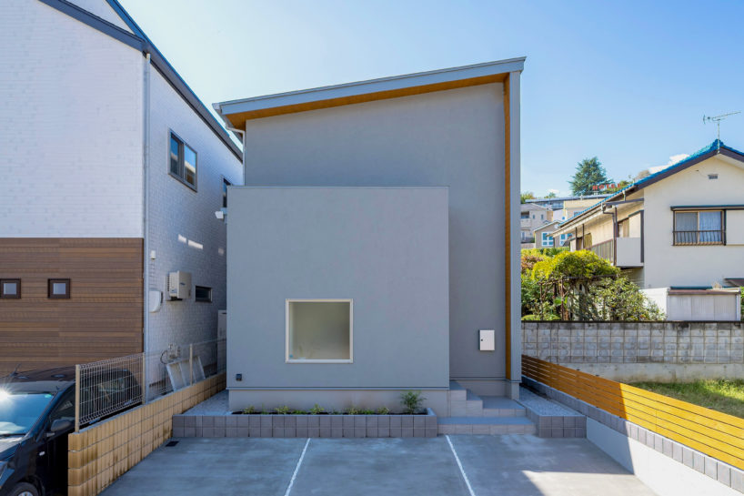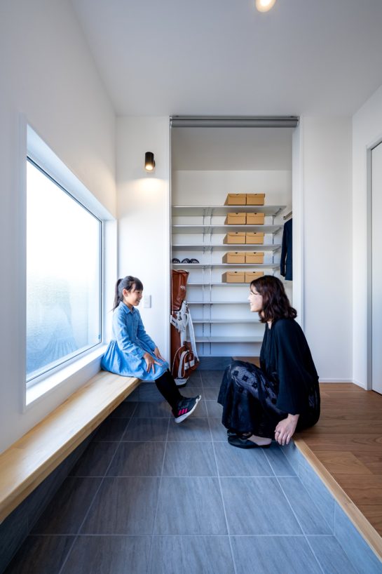やや北向きの道路面を活かして、シンプルかつスタイリッシュな外観デザインに仕上げています。南側のリビングには大きな吹抜けを設けているので、リビングがいつでも温もりに溢れる心地いい空間になります。