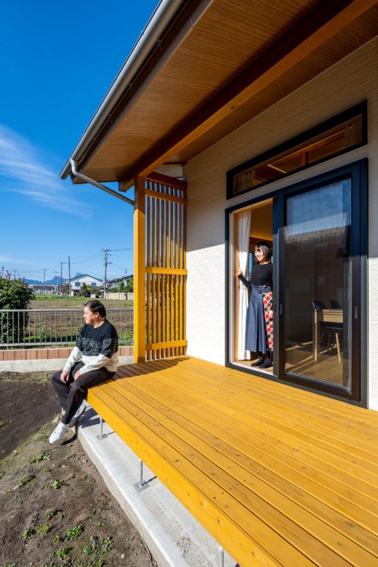 リビングからつながるウッドデッキは広い庭と室内をゆるやかにつないでくれます。深い軒により、陽射しの強い日でも心地よく過ごせます。