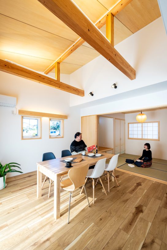 ゆとりある勾配天井リビング、組子障子が迎える和モダンの家